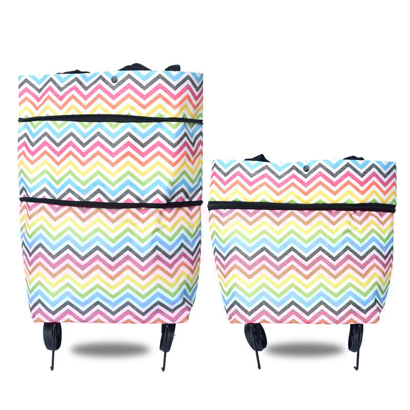 A shopping bag that makes the bag bigger and smaller by zipper. It is used daily for grocery shopping. travel shopping. towing or shoulders are very practical. and with two wheels.